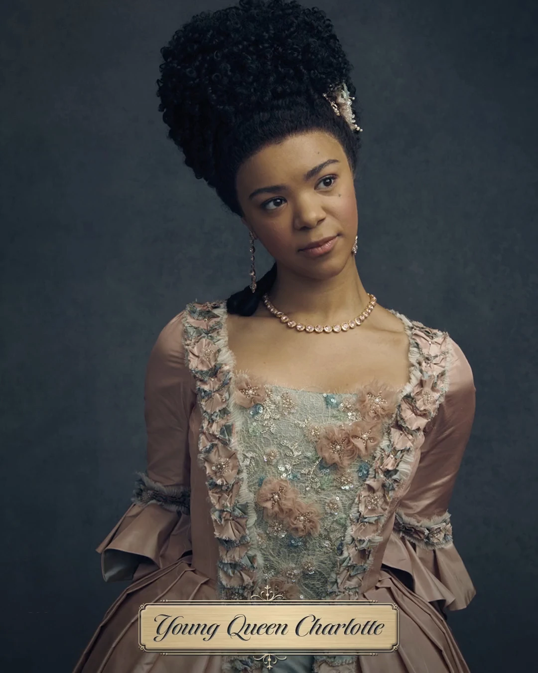 - Biografía de Netflix: Tan majestuosa como intimidante, la reina Charlotte se deleita en juzgar cada nueva cosecha de debutantes y proclamar a su favorita como el "diamante" de la temporada. Si bien encuentra divertidos los informes de Lady Whistedown, su objetivo es desenmascarar al escritor anónimo y castigarlos por atreverse a cuestionar su juicio impecable.[5]